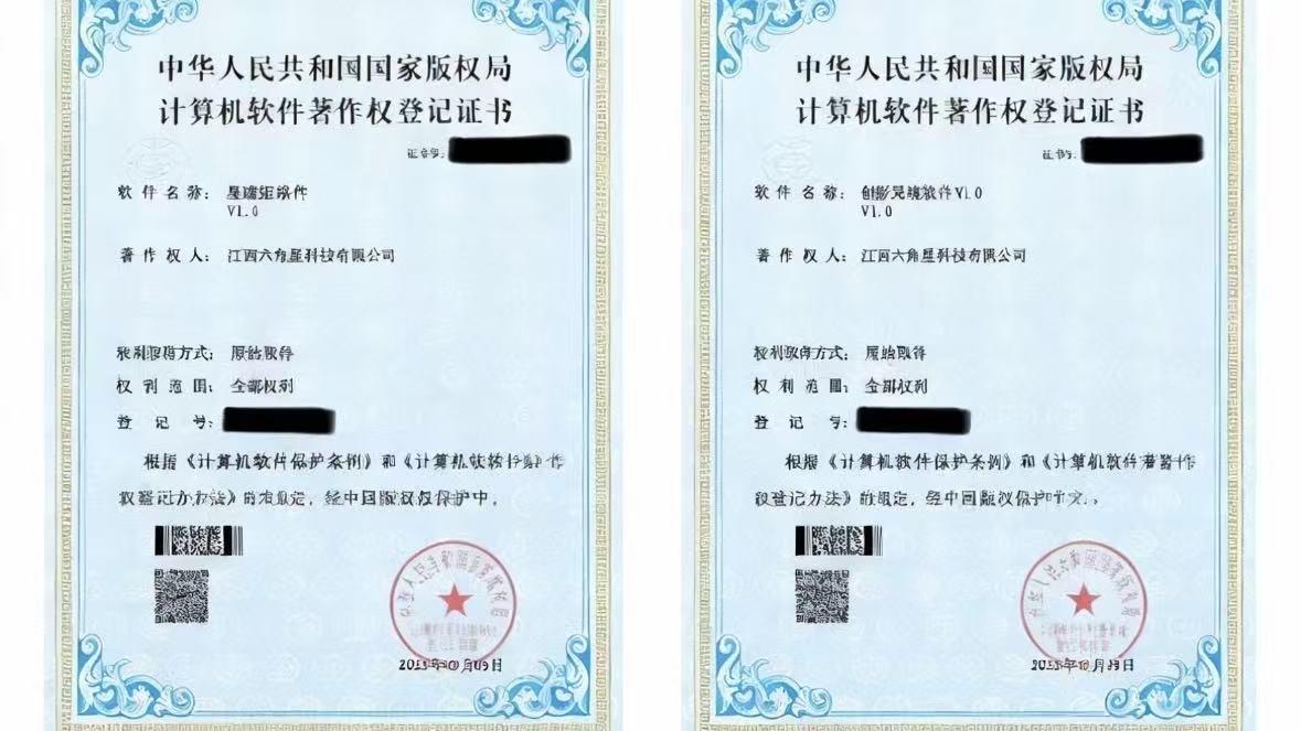 江西六角星科技自主研发的“星璇矩阵软件”“创影灵境软件”的计算机软件著作权登记证书申请成功!