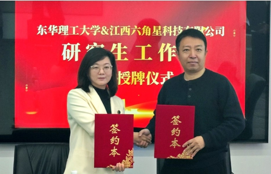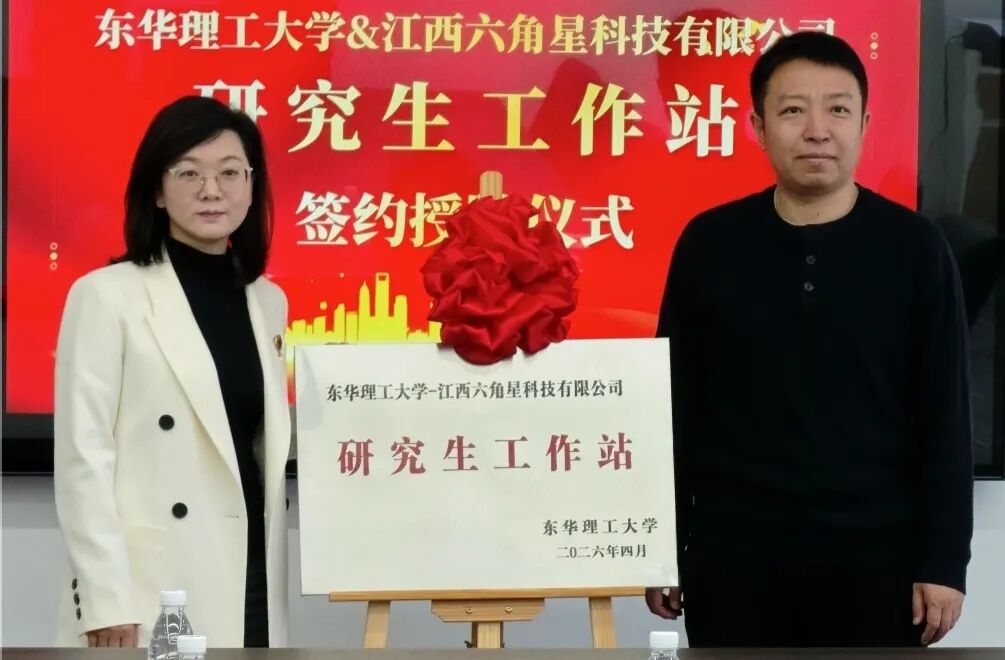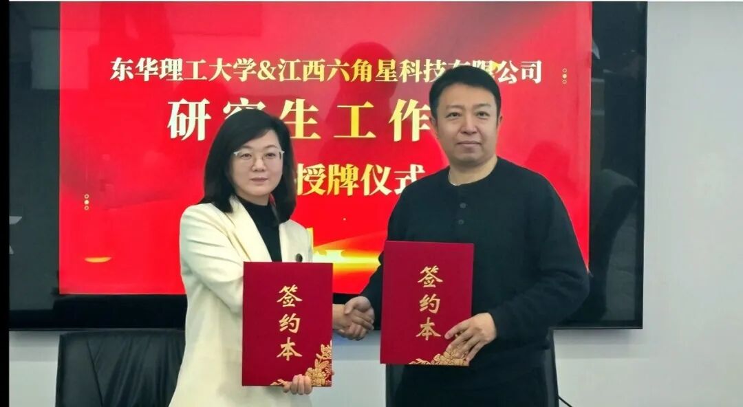 在双方代表共同见证下,六角星科技总经理孙美华与东华理工大学软件学院副院长庞振宇正式签署“研究生工作站”合作协议,并共同为工作站揭牌。这一校企协同育人平台的正式落地,标志着江西六角星科技有限公司在深度参与高端应用型人才培养、推动产学研深度融合方面迈出关键一步,开启了公司人才培育与技术创新协同发展的新征程。
