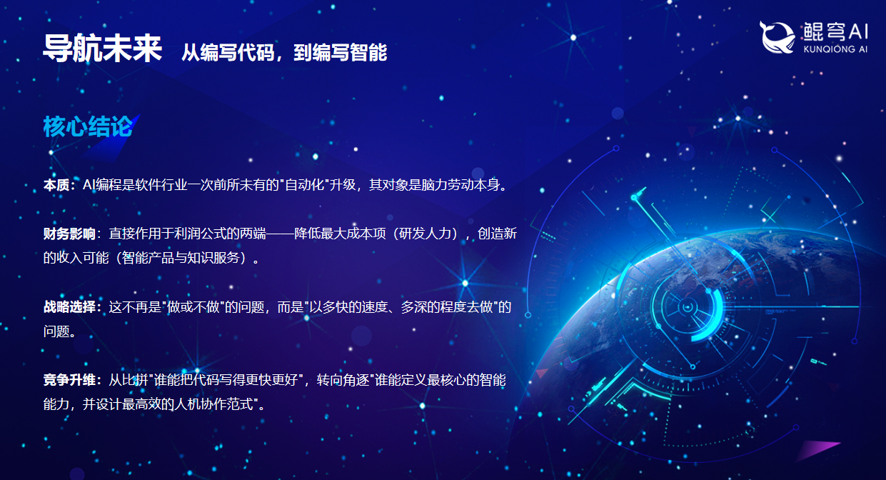 分享内容指出,当前以大模型为代表的AI技术正推动软件行业从“人力密集型开发”向“智能驱动式创造”转型。通过对Encoder与Decoder两大技术路线的深入分析,强调“生成”与“创造”已成为AI赋能软件产业的核心价值输出。同时,结合企业实践,从效率提升、流程重构、知识资产变现、人力结构优化等多个维度,阐述了AI编程如何推动软件企业从“成本中心”转向“利润引擎”。