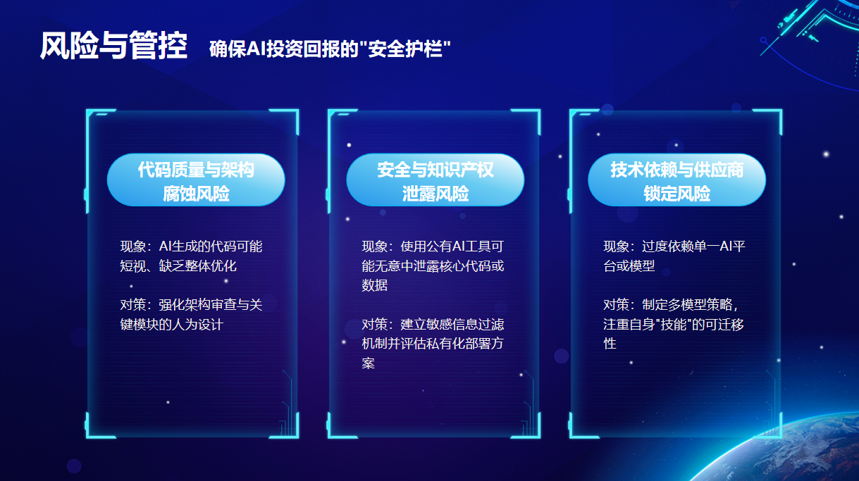面对AI编程带来的机遇与挑战,分享中提出企业应建立“架构师+AI训练师+业务专家”的新型团队结构,加强代码质量与安全治理,推进多模型策略与能力迁移,在智能时代构建可持续竞争力。
