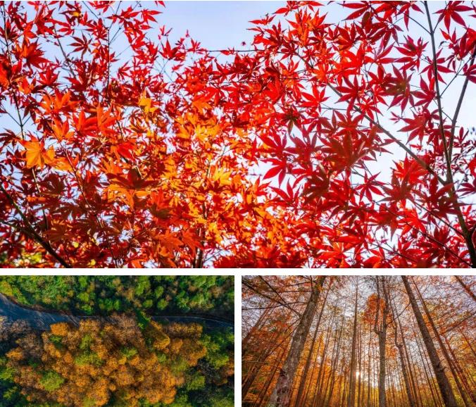 金秋时节,层林尽染,银杏金黄、枫叶火红,与古朴的村落相映成趣;
