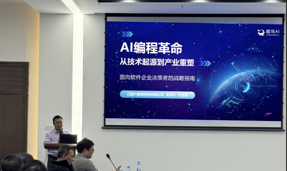 江西六角星科技有限公司董事长付福前应邀参加会议,并以《AI编程革命:从技术起源到产业重塑》为题,就人工智能技术与软件产业融合发展进行专题分享。该演讲系统阐释了AI编程的技术演进路径、产业影响与企业战略应对。